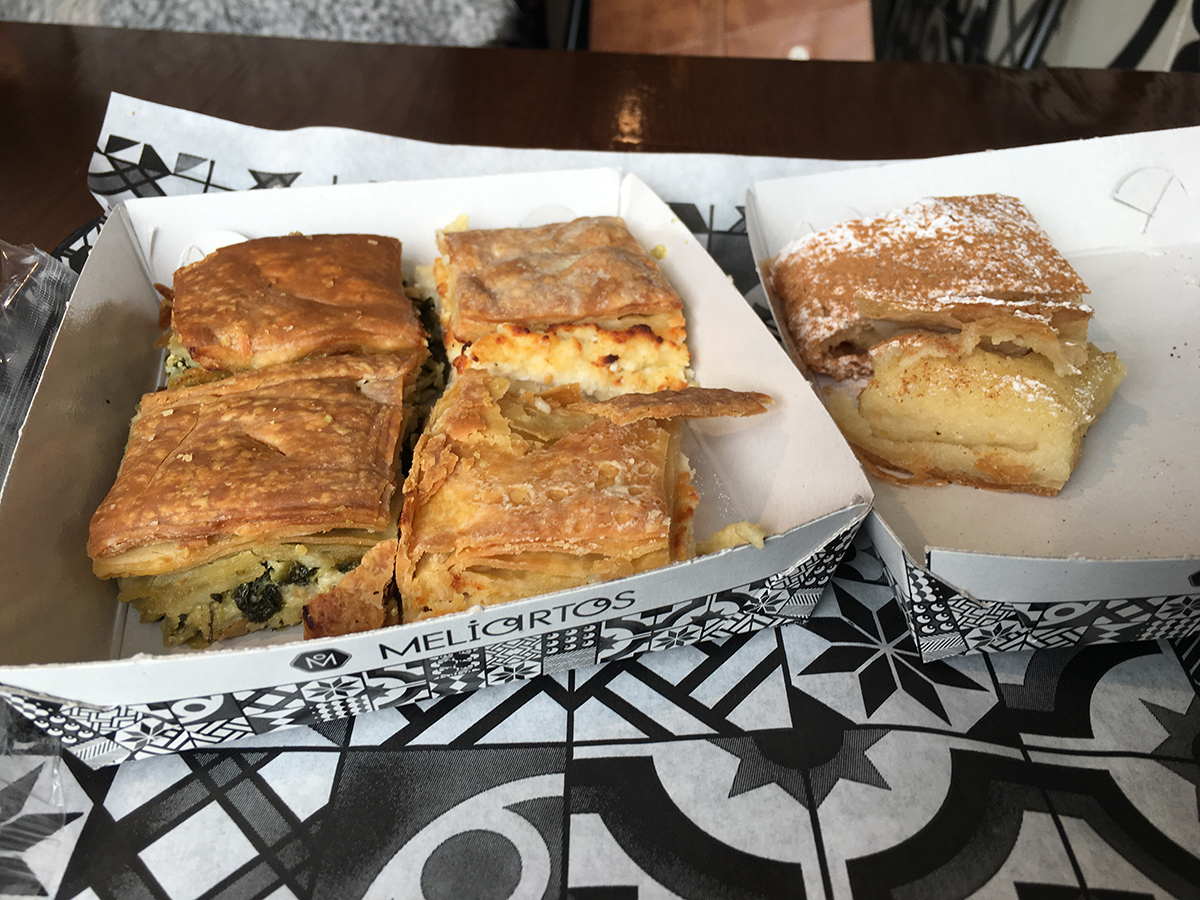 Eating the very traditional Tiropita, Spanakopita, and Bougasta