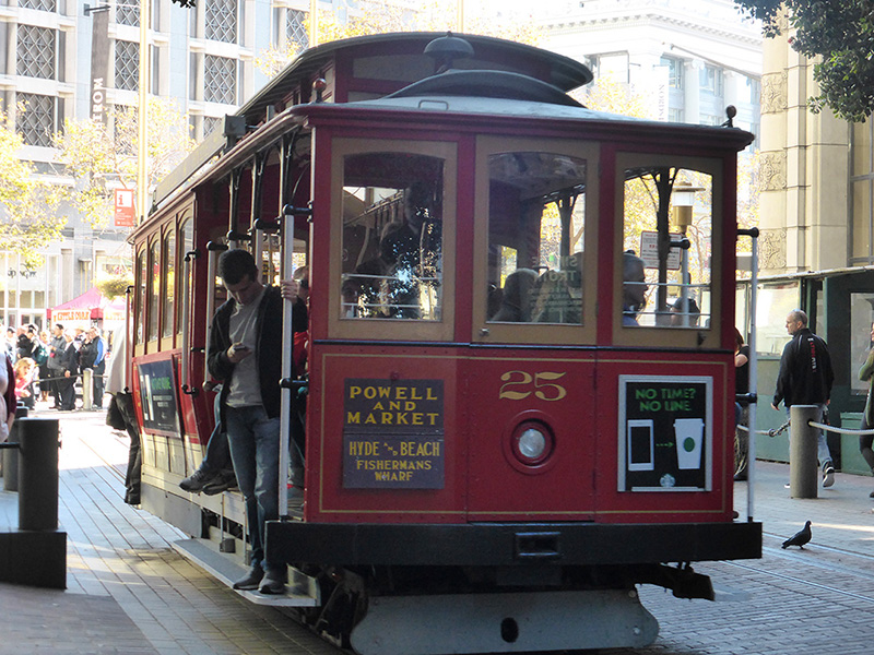 The famous cable cars, or trams of San Francisco. San Francisco is built on a lot of hills; but no one can agree on whether there are 43, 47 or 49. But that is why you need to be pulled up the hills by the cable cars.