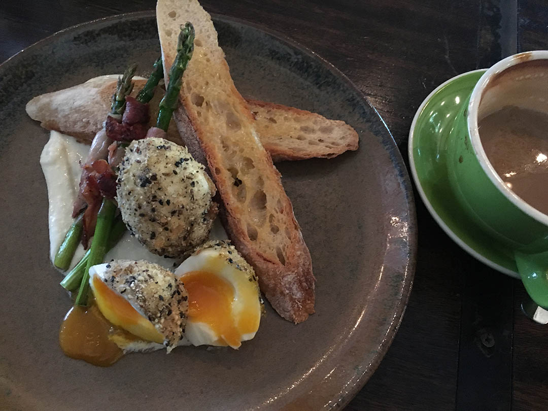 Was it worth the long wait for our breakfast? Well, yes, it was. As we waited, we enjoyed excellent coffee, but then we would expect nothing less in Australia. My breakfast was particularly good, and one I would like to have again. Sauteed Proscuitto wrapped asparagus, on whipped feta, and the star of the show were the dukkah crusted boiled runny eggs. This was served with sourdough because Berry and sourdough seem to be interchangeable terms.