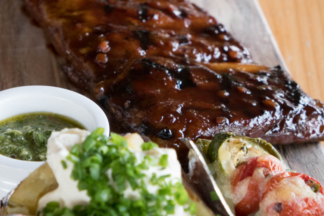 ½ Rack of Pork Ribs with Chimichurri made with finely chopped Parsley, Garlic, Olive Oil, Oregano, Chilli, Pepper & White Vinegar, and a half capsicum filled with eggplant, and other vegetables