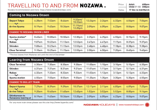 2. Take the bullet train, Hokuriku Shinkansen, from Tokyo or Ueno to Iiyama. . You then take a bus for the 20-minute drive to Nozawa Onsen. The timetable is here. You could also take a taxi, and they are waiting at the station