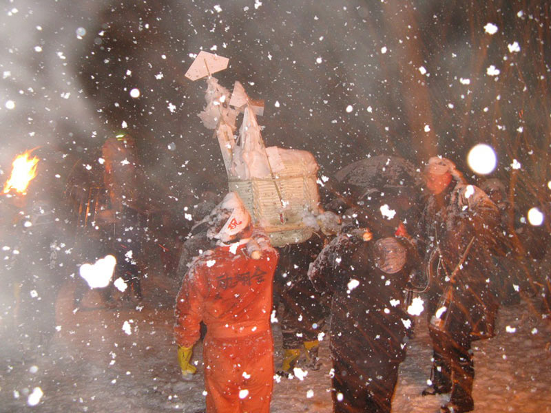 The Dojosin fire festival, or Nozawa Onsen Fire Festival, i one of the three main fire festivals in Japan had is held every year on the 15th January. This festival is bound in tradition. The basic story is that 25-year-old and 42-year-old men, believed to be the unlucky ages according to Shinto beliefs, are expected to show their bravery while building the shrine. The 42-year-olds then climb the shrine and sit there with their sake, and sing songs as they try and protect the shrine from the marauding 25 years who ram the shrine with lit faggots and burn it down.